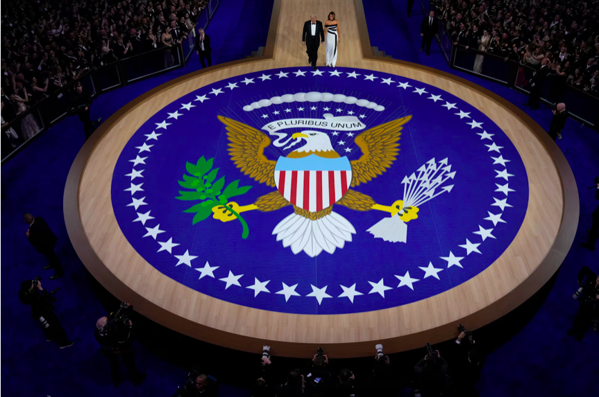Donald Trump y su esposa, Melania Trump, caminan hasta el centro del escenario para el baile de investidura. ALEX BRANDON (AP)