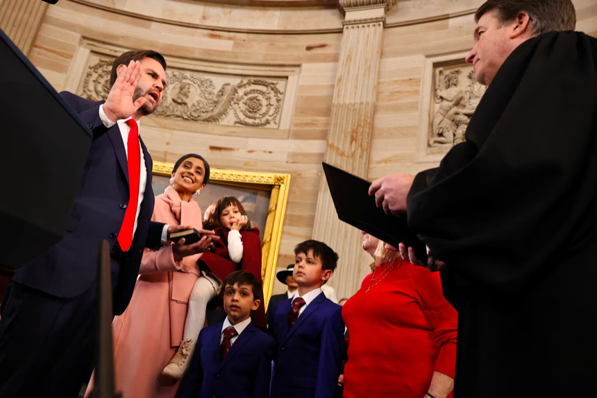 J. D. Vance jura su cargo como vicepresidente mientras su esposa, Usha Vance, y su familia observan la ceremonia. CHIP SOMODEVILLA (VIA REUTERS)