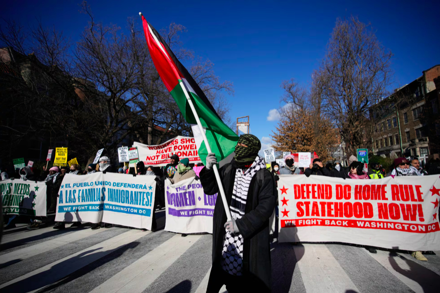 Una persona sostiene una bandera palestina en una protesta el lunes en Washington coincidiendo con la toma de posesión de Donald Trump para un segundo mandato en la Casa Blanca. BRYAN WOOLSTON (GETTY IMAGES)