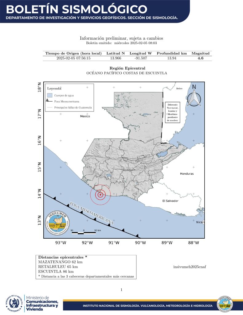 De acuerdo con el Instituto Nacional de Sismología, Vulcanología, Meteorología e Hidrología, Insivumeh, el punto de epicentro fue en Nueva Concepción, Escuintla, pero fue sensible en varias regiones del país, incluso en Chiapas, México.