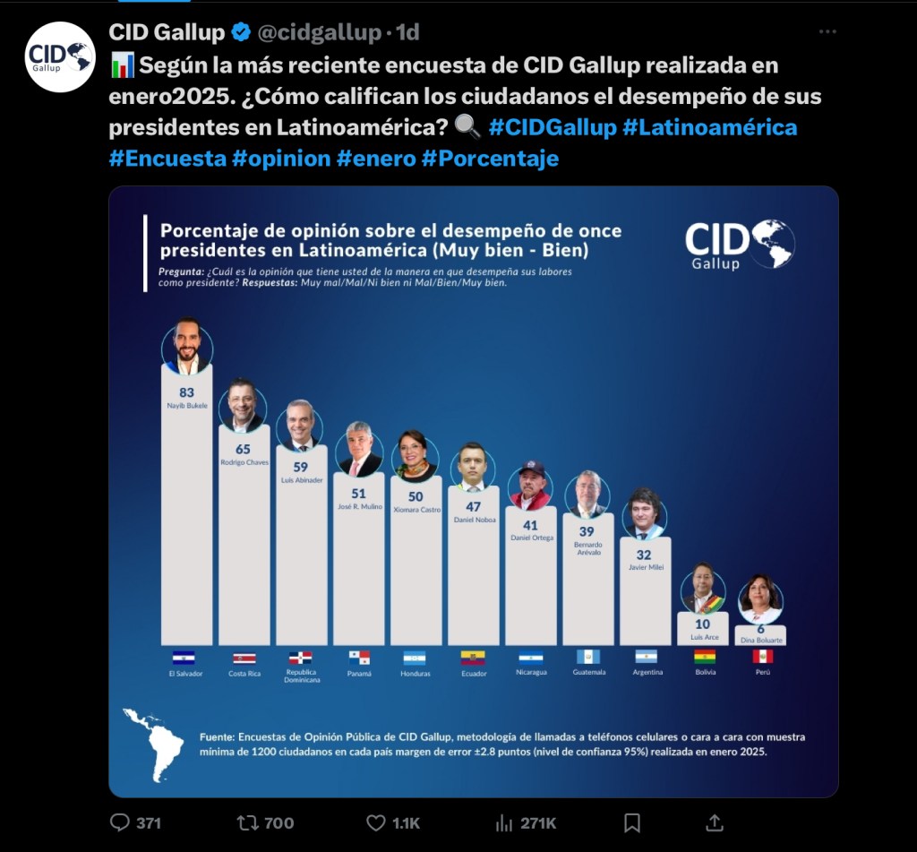 “Bukele ocupa el primer lugar con un 85%, mientras que Chaves es el segundo con un 65% de apoyo”, afirma, y destaca que los menos valorados son los mandatarios Luis Arce de Bolivia con un 10% y Dina Boluarte de Perú con un 6%.