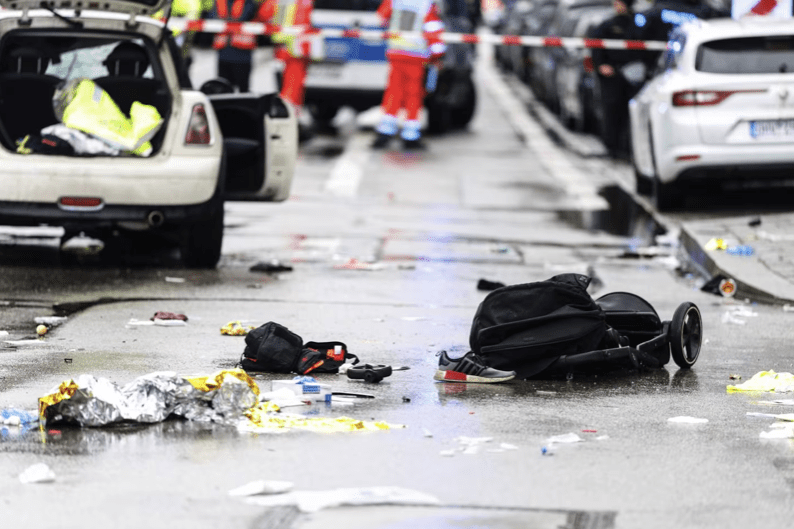 Los oficiales arrestaron al sospechoso después de disparar un tiro al coche, dijo el subjefe de policía Christian Huber. Agregó que se creía que al menos 28 personas estaban heridas, algunas de ellas de gravedad. Se vio un Mini dañado en la escena, junto con escombros, incluidos los zapatos.