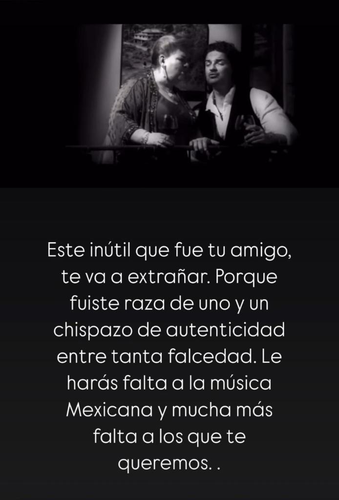 El artista guatemalteco se pronunció en sus redes sociales sobre el fallecimiento de su amiga Paquita la del Barrio “Este inutil que fue tu amigo te va a extrañar. Le harás falta a la música mexicana y mucha más falta a los que te queremos”, escribió en sus historias de Instagram.
