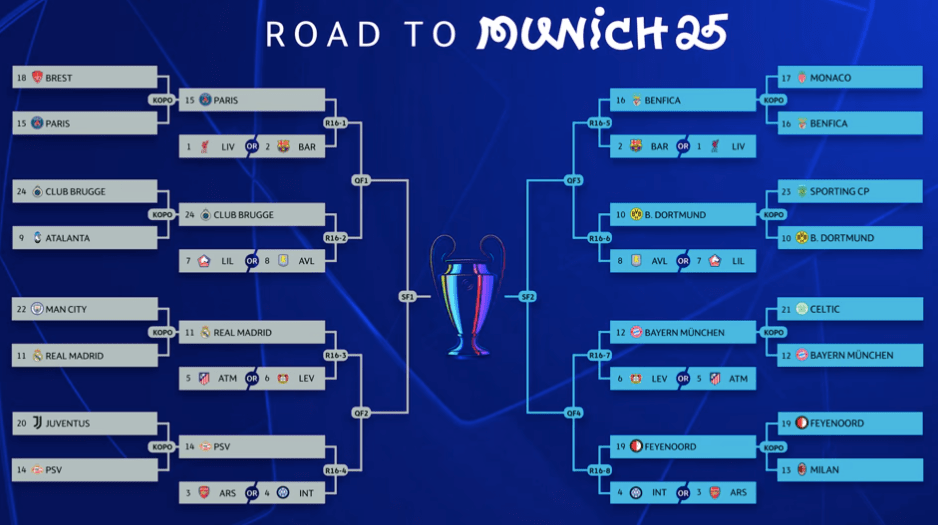 Los ocho equipos clasificados de forma directa a los Octavos entrarán de dos en dos en un bombo, es decir, Liverpool y Barcelona, Arsenal e Inter de Milán, Atlético de Madrid y Leverkusen, Lille y Aston Villa.