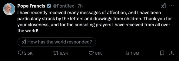 A primera hora del domingo, en un mensaje sobre X, el Papa Francisco agradeció al mundo por todos los «mensajes de afecto».