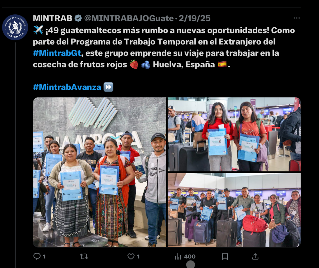 Hace solo unos días un grupo de guatemaltecos fue a trabajar a España en empresas extranjeras por 6 meses en la cosecha de frutos rojos y cítricos en Huelva.