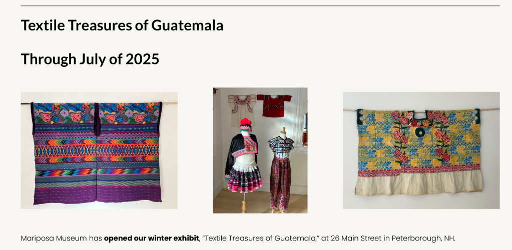 El Museo Mariposa de New Hampshire, New England, Estados Unidos tiene abierta la exposición «Tesoros de Guatemala», en la cual muestra piezas de tejidos que artesanas guatemaltecas han elaborado a lo largo de la historia.