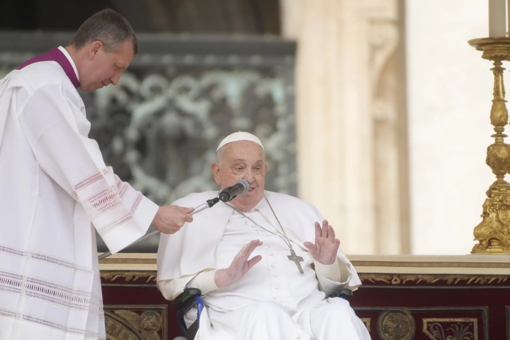 CIUDAD DEL VATICANO (AP) – Un Papa Francisco en convaleciente saludó a la multitud en St. Peter’s Square en el Domingo de Ramos, deseando a más de 20.000 fieles un «Feliz Domingo de Ramos, Feliz Semana Santa», en otra señal pública tranquilizadora de su recuperación de una batalla potencialmente mortal contra la doble neumonía.