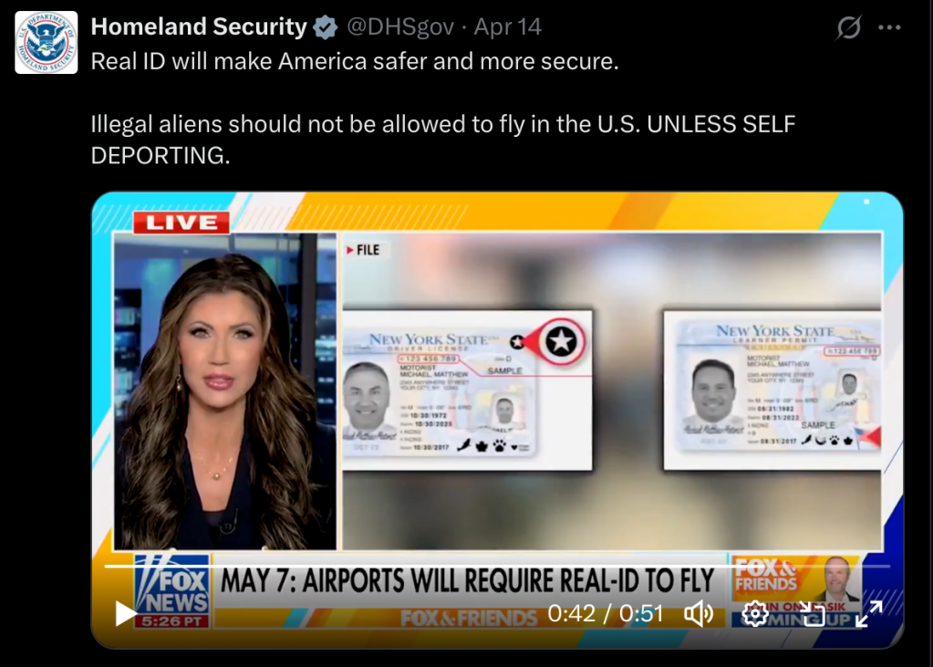 El Departamento de Seguridad Nacional ha compartido en sus redes sociales que el Real ID hará que Estados Unidos sea más seguro, y advirtió que “no se debería permitir que los inmigrantes indocumentados viajen en avión a EE. UU., a menos que se autodeporten”.