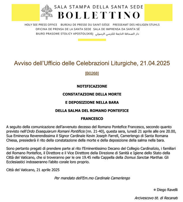 La Oficina de las Celebraciones Litúrgicas del Sumo Pontífice informó este lunes que, conforme al Ordo Exsequiarum Romani Pontificis, se ha dado inicio al protocolo funerario tras el fallecimiento del Papa Francisco.