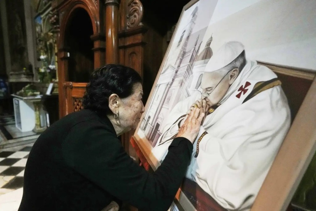 Frente al altar fue dispuesta una gran imagen del pontífice sobre un manto negro tendido en el suelo y junto a una corona de flores blancas.