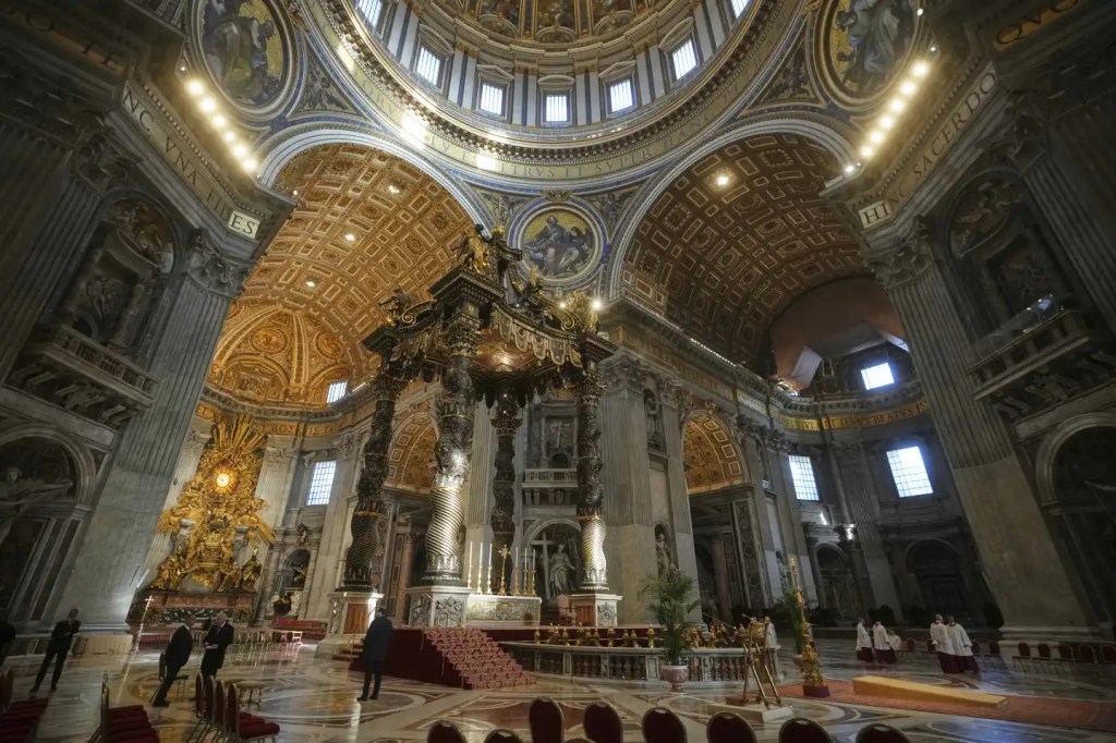 El cardenal Kevin Farrell, que administra el Vaticano temporalmente hasta que se elija un nuevo papa, encabezó la procesión, con nubes de incienso precediéndolo mientras el coro de la iglesia comenzaba a cantar el himno de la Letanía de los Santos.
