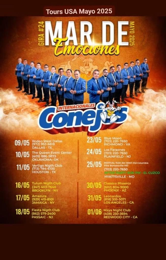 - Sábado 24 de mayo: Los Faraones, Plainfield, Nueva Jersey.