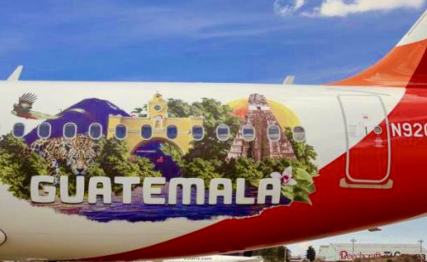 Para inaugurar el destino la aerolínea y el Instituto Guatemalteco de Turismo (Inguat), colocaron en la aeronave un collage con postales de Guatemala.