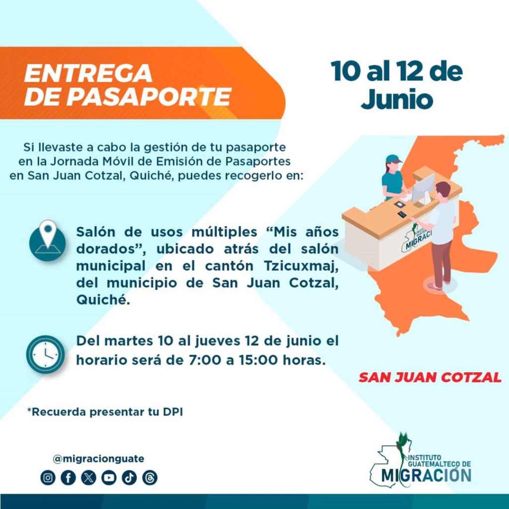El Instituto Guatemalteco de Migración (IGM) anunció una Jornada Móvil de Emisión de Pasaportes, que se llevará a cabo del martes 3 al jueves 5 de junio, en el Salón Municipal del cantón Tzicuxmaj, San Juan Cotzal, Quiché.