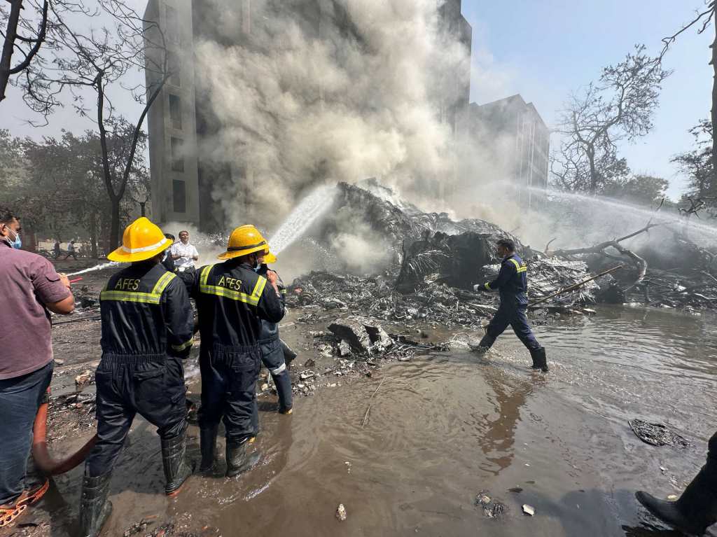 Las imágenes desde el lugar muestran columnas de humo negro elevándose entre los restos calcinados del fuselaje y edificios cercanos alcanzados por las llamas.