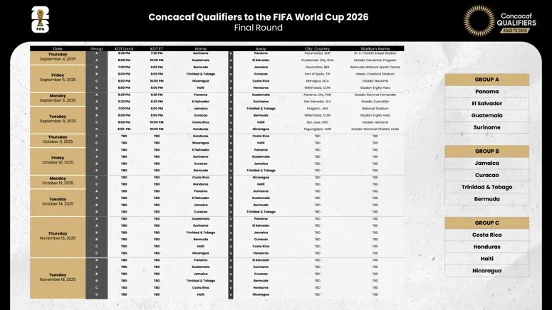 Es oficial: Concacaf ha revelado el calendario completo de la Ronda Final de las Eliminatorias rumbo a la Copa Mundial de la FIFA 2026. La batalla definitiva por los últimos boletos al Mundial se librará entre septiembre y noviembre de 2025, en las ventanas FIFA, con partidos que prometen emoción y drama en cada jornada.