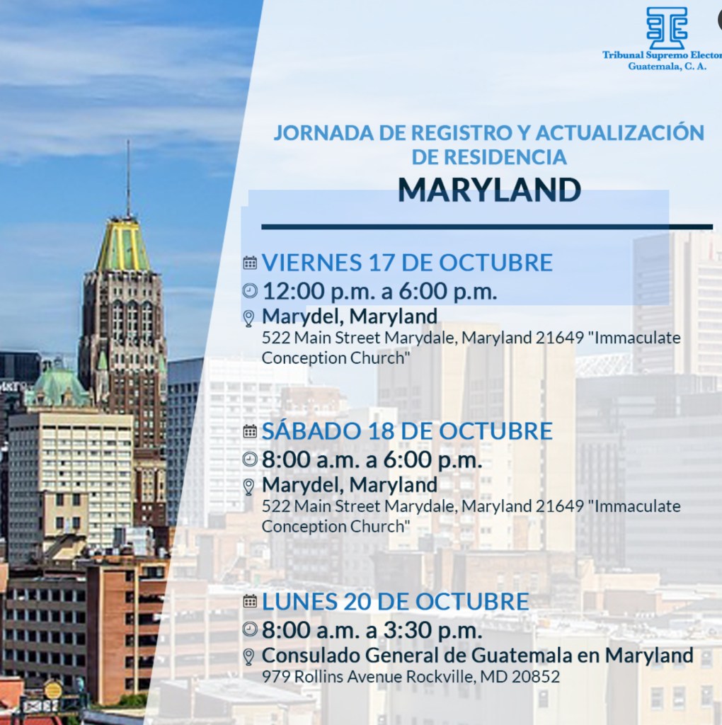 “Si resides en Maryland te invitamos a registrarte o actualizar tus datos para votar desde el extranjero. Si conoces a más guatemaltecos, infórmales que pueden dirigirse a: Marydel, Maryland 522 Main Street Marydale, Maryland 21649, Immaculate Conception Church», explica el TSE.