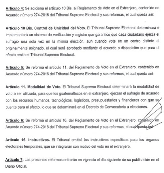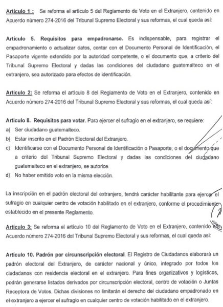 La modificación, publicada en el diario oficial, armoniza la normativa electoral con lo establecido en el Código de Migración, cuyo artículo 90 reconoce el pasaporte como documento de identidad de los guatemaltecos en el extranjero, emitido exclusivamente por el Instituto Guatemalteco de Migración.