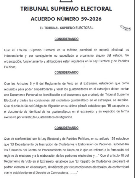 El pasado 2 de marzo oficializó, mediante el acuerdo 59-2026, una reforma al Reglamento de Voto en el Extranjero que actualiza las disposiciones vigentes desde 2016 y reconoce formalmente el pasaporte como documento válido para empadronarse y sufragar fuera de Guatemala.